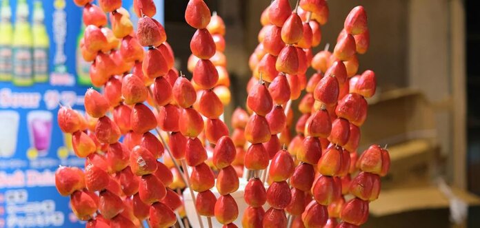 fruta (normalmente fresas y/o uvas) colocadas en un palo de brocheta y embadurnadas de un jarabe casero de azúcar que, al solidificar, forma una capa crujiente por fuera y mantiene intacto lo tierno de la fruta por dentro.